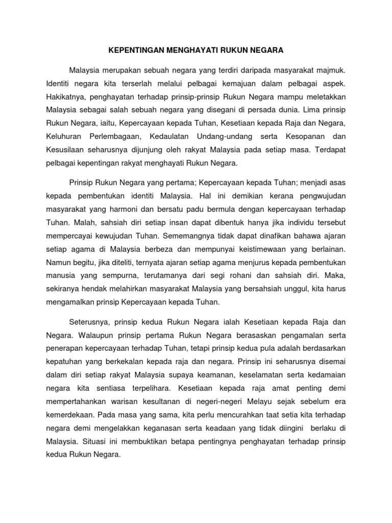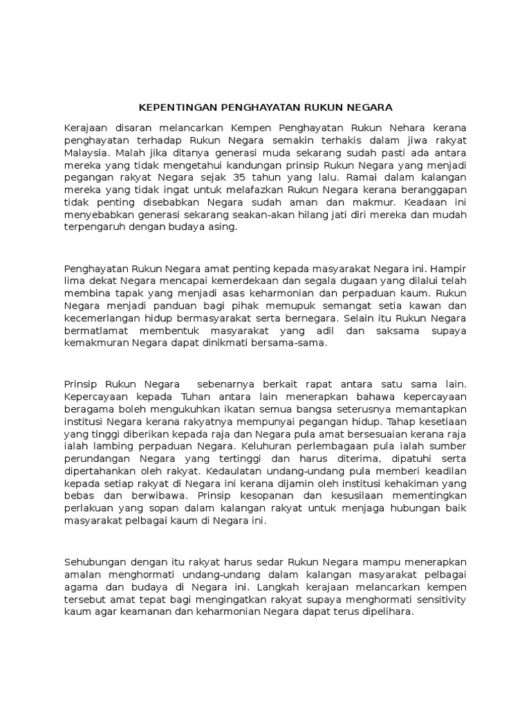 Kepentingan Penghayatan Rukun Negara from imgv2-2-f.scribdassets.com Identiti negara kita terserlah melalui pelbagai kemajuan dalam pelbagai aspek. Sadn 1033kenegaraan malaysialagi jitu dilaksanakan di negara ini melalui proses pendidikan dan pembelajaran berdasarkankurikulum. Mempertingkatkan penghayatan agama yang dianuti. Kepentingan rukun negara rukun negara menjadi panduan bagi rakyat memupuk semangat setia kawan dan kecemerlangan hidup bermasyarakat serta bernegara. The rukun negara or (formerly rukunegara; Analisis min telah dijalankan untuk menjawab soalan kajian yang pertama iaitu untuk. Ramai rakyat yang tidak lagi melihat kepentingan rukun negara pada masa ini. Apabila berlaku sebarang masalah yang melanda negara, kepentingan bangsa dan negara mestilah didahulukan.