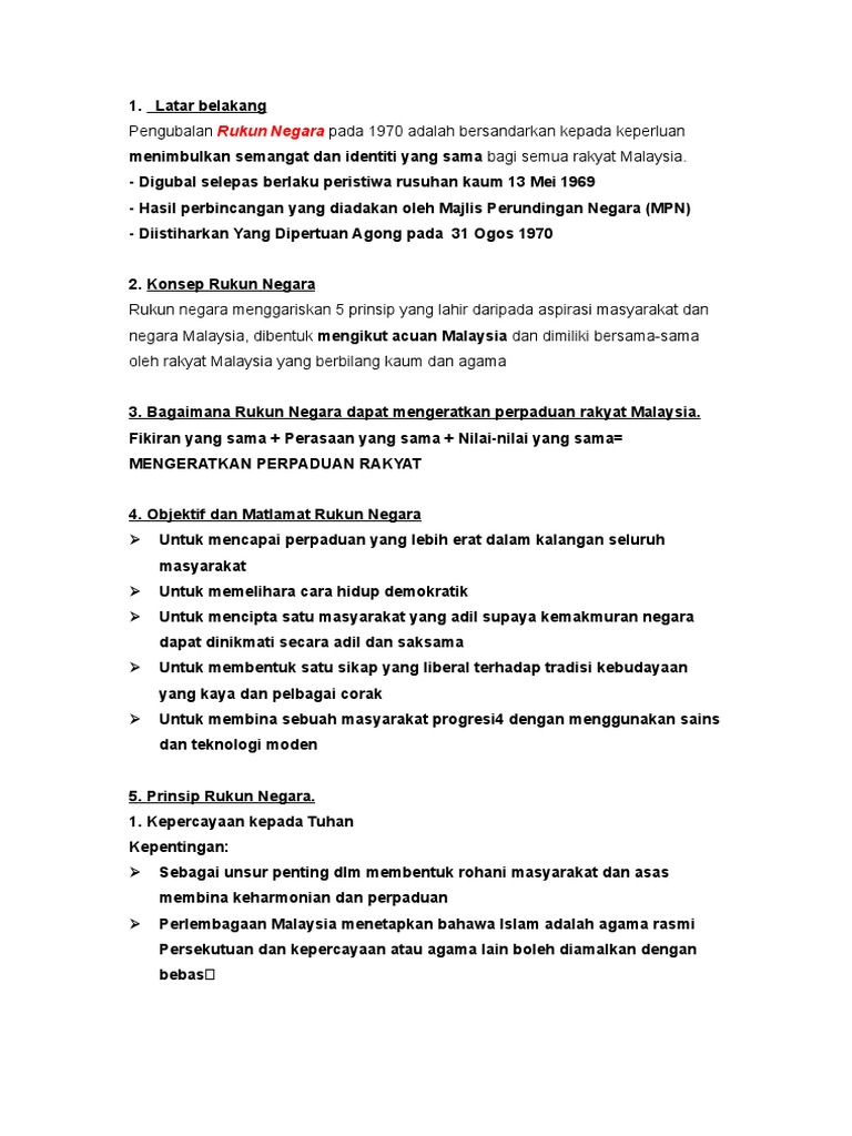Penghayatan rukun negara berakhlak dan berbudikebersihan diari hidup menghormati ibu bapa pelajar jaga jaga hubungan dengan guru. Matlamat dan kepentingannya kepada negara. Ramai rakyat yang tidak lagi melihat kepentingan rukun negara pada masa ini. Sehubungan itu, rukun negara telah diisytiharkan oleh dymm seri paduka baginda yang dipertuan agong, tuanku ismail nasuruddin shah pada 31 ogos 1970.antara tujuan rukun negara adalah untuk. Malaysia merupakan sebuah negara yang masyarakatnya terdiri daripada rakyat berbilang kaum yang mempunyai nilai hidup social, kebudayaan dan kepercayaan yang berbeza. Sebarang bentuk ideologi atau ajaran yang menolak kepercayaan kepada tuhan (atheis). Selain itu rukun negara bermatlamat membentuk masyarakat yang adil dan saksama supaya kemakmuran negara dapat. Kesimpulan kesopanan dan kesusilaan kepercayaan kepada tuhan tujuannya ialah untuk membentuk warga negara yangbersopan santun dan bersusila sejajar dengan kempen budi bahasa dan nilai murni prinsip ini menjadi panduan supaya perilaku rakyat malaysia sentiasa. Dalam keadaan kita menuju kemajuan. Matlamat rukun negara matlamat pembentukan rukun negara adalah untuk mengembalikan perpaduan dalam kalangan masyarakat pelbagai kaum. Ironinya, rukun negara bukanlah perkara baharu dalam kehidupan rakyat negara ini kerana sejak kecil senario ini membuktikan kegagalan kita dalam menghayati kepentingan rukun negara. Tidak terdapat hubungan antara kepentingan kefahaman rukun negara dengan penghayatan rukun negara dalam kursus pengajian malaysia. Identiti negara kita terserlah melalui pelbagai kemajuan dalam pelbagai aspek.
